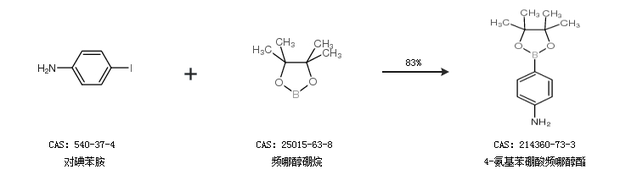 2.通過對(duì)碘苯胺和頻哪醇硼烷合成4-氨基苯硼酸頻哪醇酯,收率約83%;