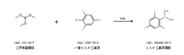 2.通過三甲氧基硼烷和1-溴-2,4,6-三氟苯合成2,4,6-三氟苯硼酸,收率約64%;