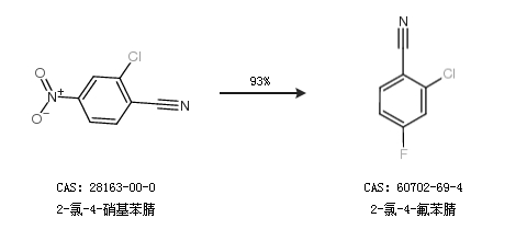 1.通過2-氯-4-硝基苯腈合成2-氯-4-氟苯腈,收率約93%;