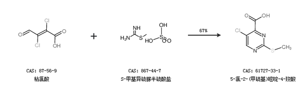 2.通過粘氯酸和S-甲基異硫脲半硫酸鹽合成5-氯-2-(甲硫基)嘧啶-4-羧酸,收率約67%;