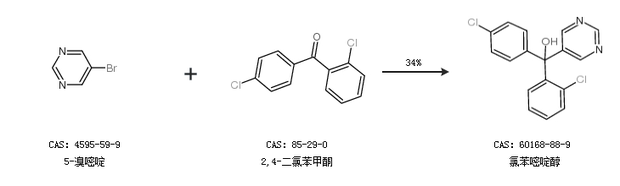 2.通過5-溴嘧啶和2,4-二氯苯甲酮合成氯苯嘧啶醇,收率約34%;