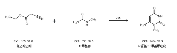 2.通過氰乙酸和N-甲基脲合成6-氨基-1-甲基尿嘧啶,收率約69%;