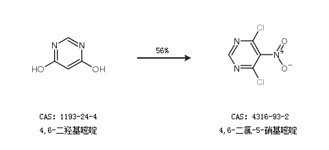 2.通過4,6-二羥基嘧啶合成4,6-二氯-5-硝基嘧啶,收率約56%;