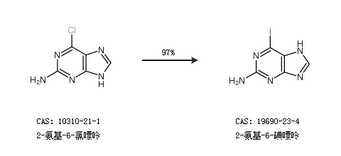 1.通過2-氨基-6-氯嘌呤合成2-氨基-6-碘嘌呤,收率約97%;