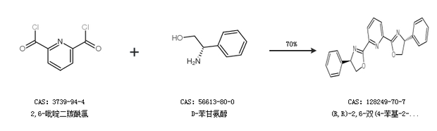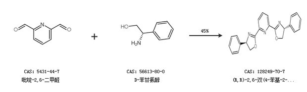 1.通過2,6-吡啶二羰酰氯和D-苯甘氨醇合成(R,R)-2,6-雙(4-苯基-2-惡唑啉-2-基)吡啶,收率約70%;