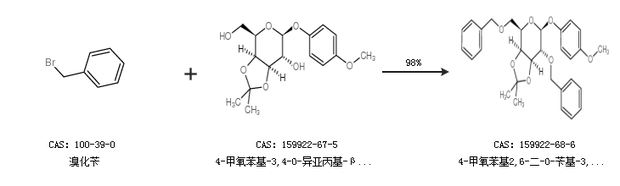 1.通過(guò)溴化芐和4-甲氧苯基-3,4-O-異亞丙基-β-D-吡喃半乳糖苷合成4-甲氧苯基2,6-二-O-芐基-3,4-O-異亞丙基-β-D-吡喃半乳糖苷,收率約98%;