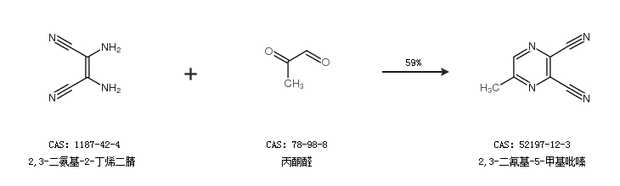1.通過(guò)2,3-二氨基-2-丁烯二腈和丙酮醛合成2,3-二氰基-5-甲基吡嗪,收率約59%;