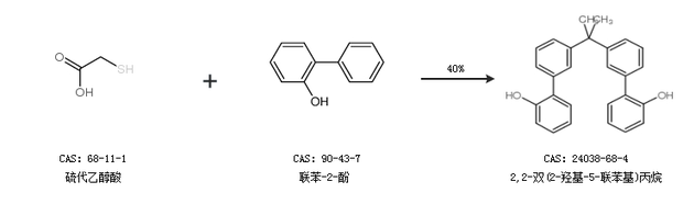 1.通過(guò)硫代乙醇酸和聯(lián)苯-2-酚合成2,2-雙(2-羥基-5-聯(lián)苯基)丙烷,收率約40%;