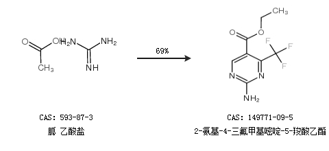 2.通過胍 乙酸鹽合成2-氨基-4-三氟甲基嘧啶-5-羧酸乙酯,收率約69%;