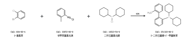 2.通過2-溴氯苯、鄰甲苯基氯化鎂和二環(huán)己基氯化膦合成2-二環(huán)己基磷-2''-甲基聯(lián)苯,收率約49%;