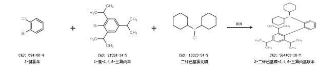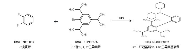 1.通過2-溴氯苯、1-溴-2,4,6-三異丙苯和二環(huán)己基氯化膦合成2-二環(huán)己基磷-2,4,6-三異丙基聯(lián)苯,收率約81%;